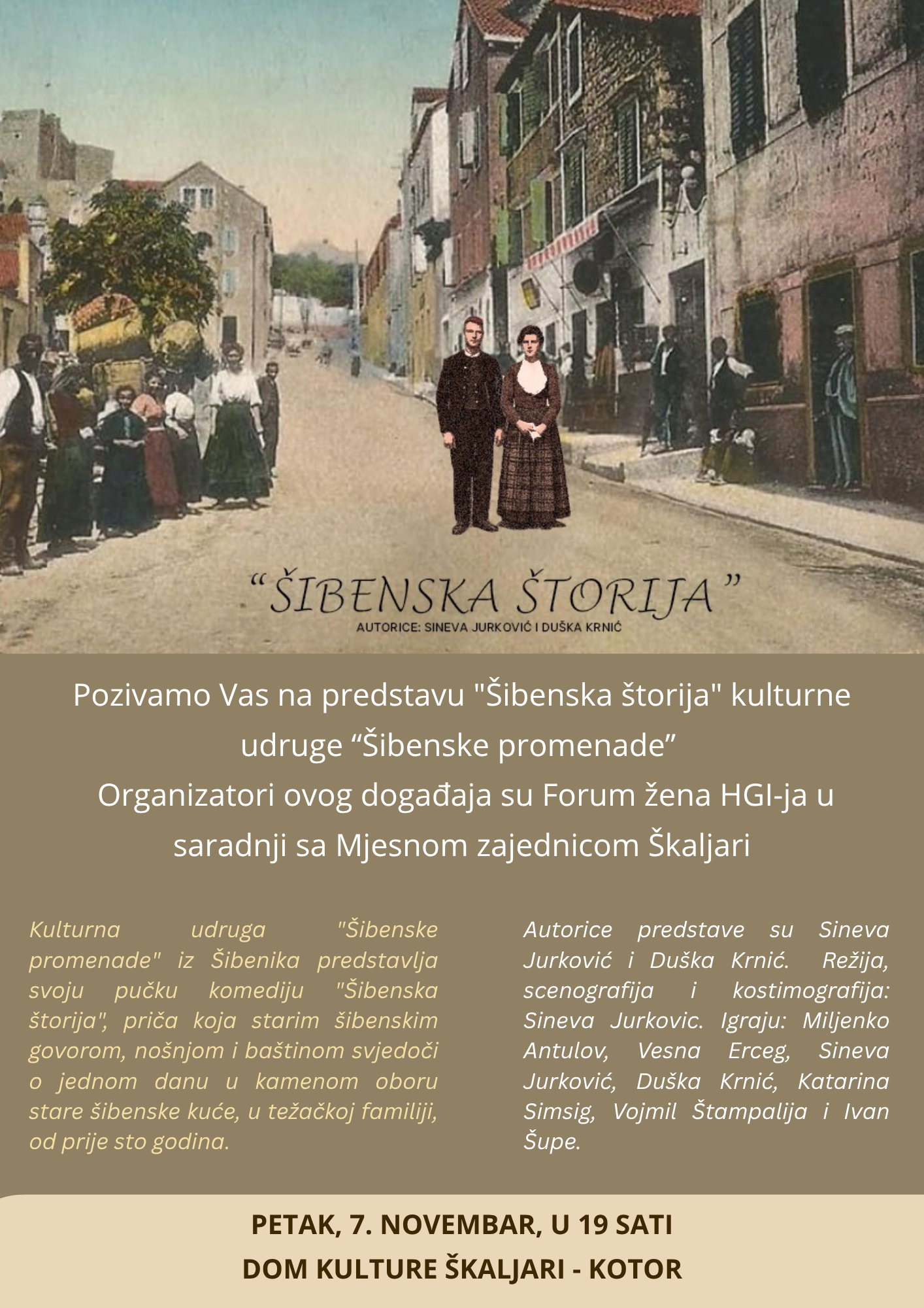 Pučka komedija amatera glumaca  Kulturne udruge Šibenske promenade,  pod nazivom Šibenska štorija, odigrat će se u petak, 7. 11., u 19 h,  u Domu kulture  Škaljari. Organizatori ovog događaja su Forum žena HGI-ja u suradnji s Mjesnom zajednicom Škaljari.