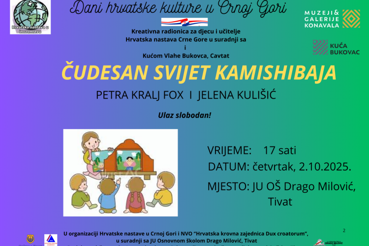 "Pozivamo vas da nam se pridružite na manifestaciji Dani hrvatske kulture u Crnoj Gori – susretu na kojem s ponosom čuvamo i dijelimo bogatstvo hrvatske riječi, pjesme, umjetnosti i običaja. U organizaciji Hrvatske nastave u Crnoj Gori , a u suradnji s NVO Hrvatska krovna zajednica Dux Croatorum , ovaj događaj okuplja nas u duhu zajedništva i kulturnih razmjena. Projekt je podržan kroz javni konkurs pod pokroviteljstvom Sekretarijata za djelatnosti Opštine Tivat , kojima upućujemo iskrenu zahvalnost. Posebni čar programa daju naše gošće iz Republike Hrvatske, iz Cavtata – Petra Kralj Fox , muzejska pedagoginja, i Jelena Kulišić , savjetnica odgajatelja. One će voditi kreativne radionice posvećene kamišibaju – tradicionalnom japanskom „papirnatom kazalištu“, spoju pripovijedanja, glume i likovne umjetnosti. Kamišibaj, premda dolazi iz Japana, sve je popularniji u europskim knjižnicama, vrtićima i školama, a danas ga – zahvaljujući našim gošćama – otkrivamo i u Boki kotorskoj" - pozivaju organizatori te poručuju "Dani hrvatske kulture u Crnoj Gori – radosno slavlje kreativnosti i pripadnosti".