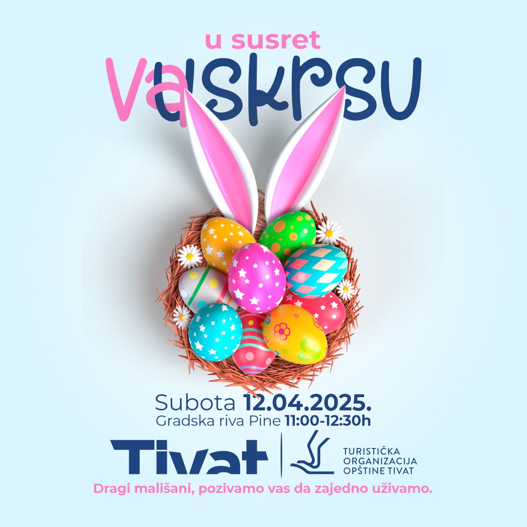 Turistička organizacija Tivat će i ove godine organizirati dječji program ,,U susret Uskrsu/Vaskrsu”, koji će se održati na Gradskoj rivi Pine, u subotu, 12. 4., s početkom u 11:00 h. Riječ je o događaju za djecu, a program će činiti plesni klubovi grada Tivta. U programu će sudjelovati Plesni klub Modest, Baletska grupa, Gimnastički klub, Plesni klub Diamond i Plesni klub Bellissima, a na kraju događaja maskota Zeko će podijeliti dječici čokoladna jaja.