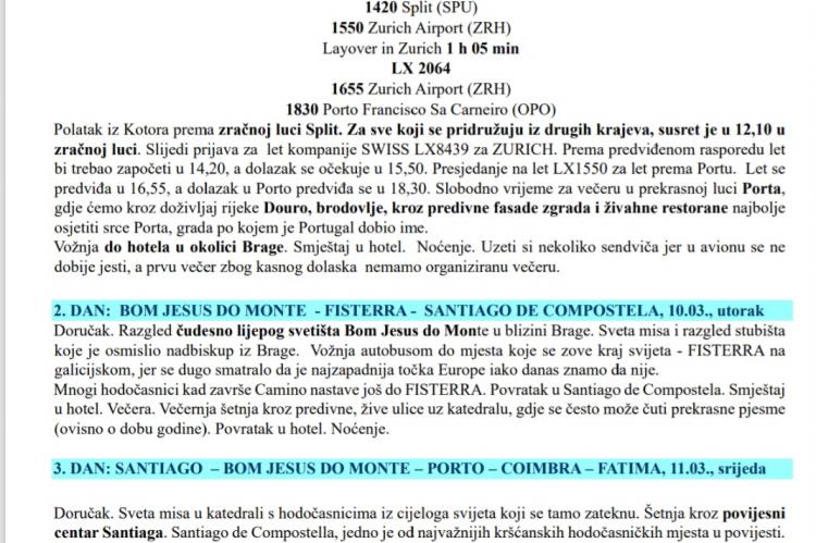 1.  DAN: KOTOR – SPLIT – ZURICH – PORTO - SANTIAGO DE COMPOSTELA 09. 03., ponedjeljak