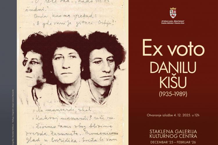 U organizaciji JU Kulturni centar „Nikola Đurković“ Kotor / Gradske biblioteke i čitaonice u četvrtak 4.12., u 12 sati u Staklenoj galeriji Kulturnog centra bit će otvorena izložba povodom 90 godina od rođenja Danila Kiša: „Ex voto Danilu Kišu (1935–1989)“ autora Marije Starčević i Voislava Bulatovića.