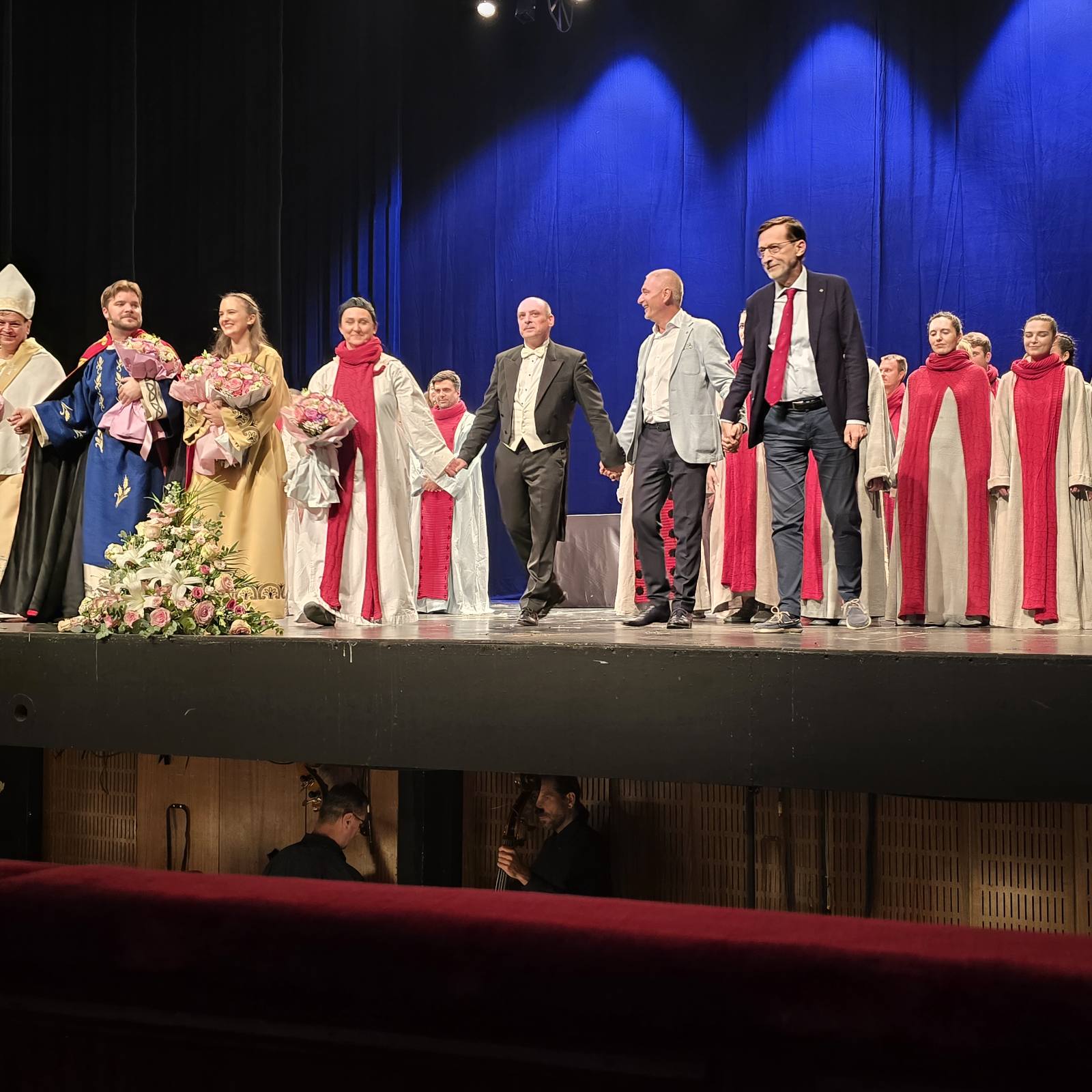 Na pozornici splitskog HNK-a nastupili su renomirani operni solisti iz HNK u Zagrebu – Roko Radovan, Josipa Bilić i Siniša Štork – uz glumce HNK Mostar Roberta Pehara, Nikolinu Marić, Ivu Krešića i Mirelu Kordić koji su izveli naratorske uloge. U izvedbi su sudjelovali i Orkestar HNK Split te Zbor HNK Mostar.