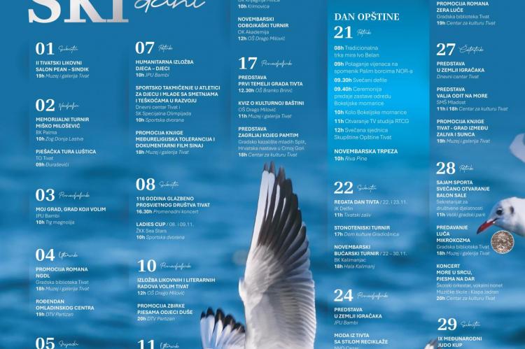 Uoči Dana općine Tivat, lokalna uprava, gradske kulturne ustanove, odgojno-obrazovne institucije te brojne nevladine i sportske organizacije predstavljaju kalendar „Novembarskih dana“. Ovogodišnji program broji gotovo 60 različitih sadržaja – od koncerata, likovnih izložbi, promocija knjiga, filmskih projekcija i kazališnih predstava do sportskih turnira i kreativnih radionica. Dio manifestacija financijski je podržala Općina Tivat.