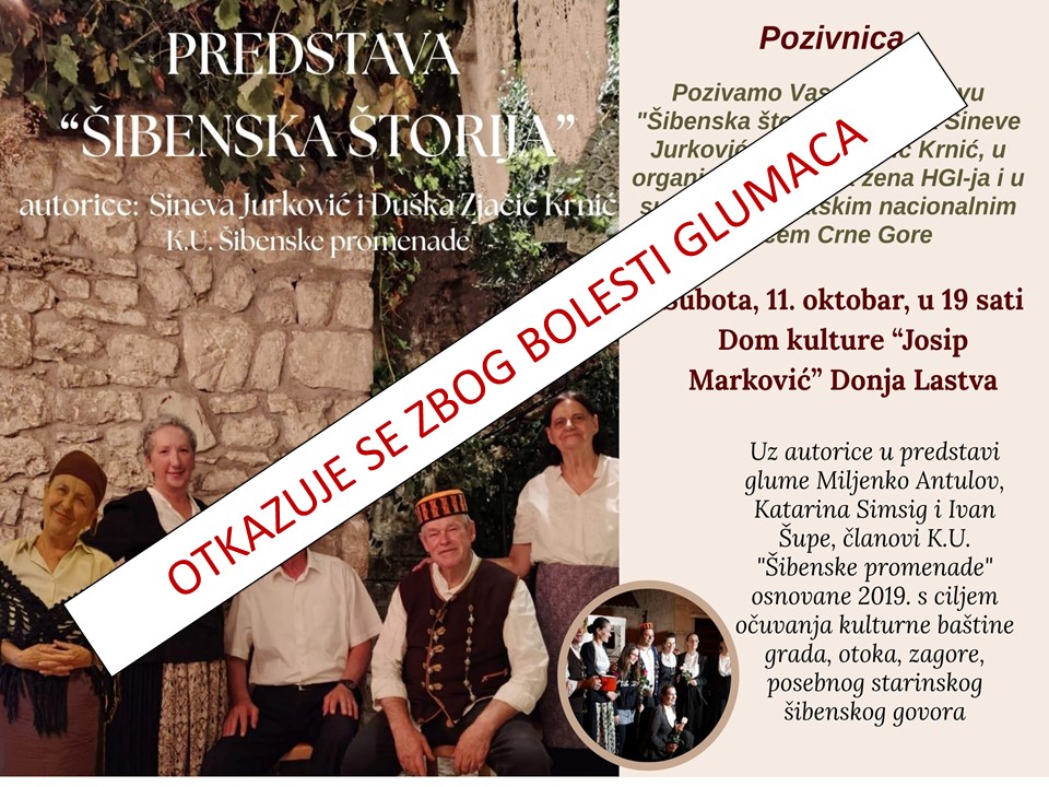 Kulturna udruga „Šibenske promenade“ gostuje u Kotoru i Tivtu  s predstavom „Šibenska štorija“, koju potpisuju autorice Sineva Jurković i Duška Zjačić Krnić. Predstava će biti izvedena u petak, 10. 10., u 19 sati,  u Domu kulture Škaljari (Kotor), te u subotu, 11. 10.,  u 19 sati, u Domu kulture „Josip Marković“ u Donjoj Lastvi (Tivat).