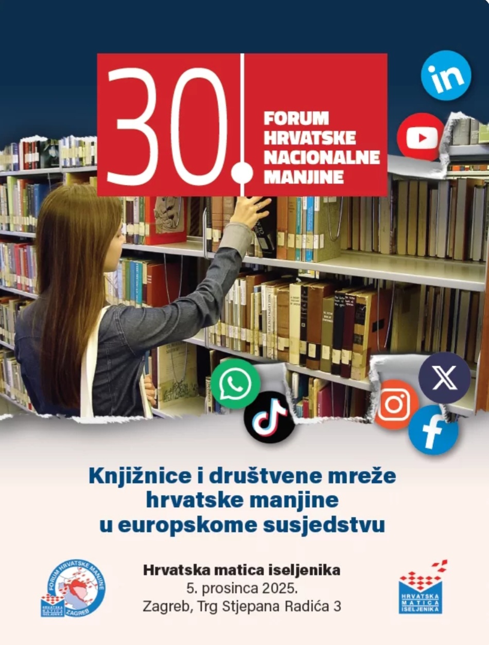 Hrvatska matica iseljenika organizira 30. Forum hrvatske nacionalne manjine koji će se održati u petak, 5. prosinca 2025. u Zagrebu pod naslovom „Knjižnice i društvene mreže hrvatske manjine u europskome susjedstvu“.