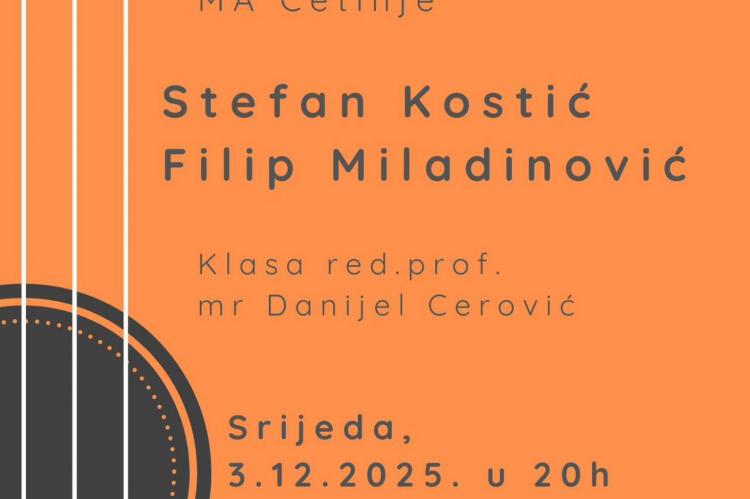 U Muzičkoj školi Tivat, večeras,  3. 12., očekuje vas   koncert Stefana Kostića i Filipa Miladinovića, studenta gitare u  klasi  profesora Danijela Cerovića. Početak koncerta je u 20 sati.