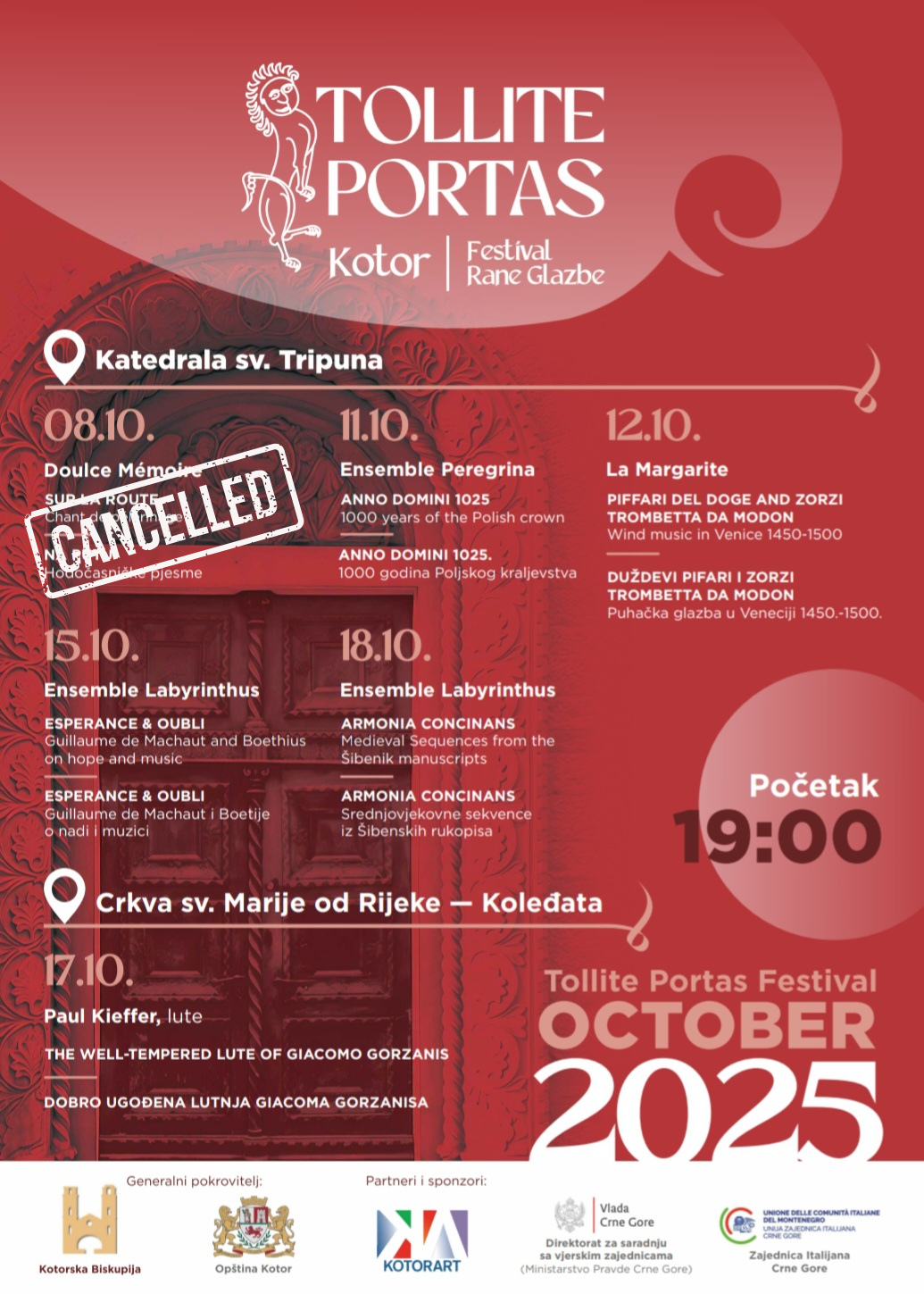 Novo izdanje Festivala za ranu i srednjovjekovnu glazbu Tollite Portas, koji će se održati od 11. 10. do 18. 10. 2025. godine u Kotoru, donosi nam pest pomno osmišljenih i premijernih programa u izvedbi uglednih umjetnika i stručnjaka za povijesno informiranu glazbenu interpretaciju. Festival je za ovogodišnju okosnicu izabrao Jubilejsku godinu, sa središnjim temama nade i hodočašća. Poziv na oživljavanje nade koja ne razočarava u našem fragmentiranom i rastrzanom svijetu uputio je pokojni papa Franjo u Proglasu godine jubileja, a hodočasnička praksa u srednjem vijeku osim pobožnosti, značila je razmjenu kultura i ideja, gradnju mostova koji povezuju različite zemlje u međusobno obogaćujućim susretima. Značaj hodočasničkih ruta prepoznao je i UNESCO te ih je uvrstio ih na popis svjetske baštine.