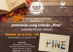 JU Gradska biblioteka Tivat organizira promociju svog novog izdanja “Pine”, autorice Marije Nikolić, koja će se održati u nedjelju, 30. 11., s početkom u 17 sati, u Multimedijalnoj dvorani Općine Tivat.