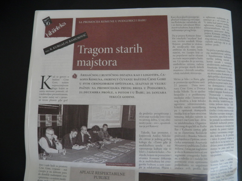 Metaforički kazano, izlazak na komun u komunikacijskom smislu jeste promišljanje, pitanje i sučeljavanje argumentima u korist zajednice, njenih potreba i interesa. Reflek¬sija togi takvog smisla i osjećaja pripadnosti komuni jeste i istoimeni časopis, kao posve prirodna i profesionalna reakcija na kulturu samosvjesti i su-odgovornosti života u za¬jednici. Kao otvorenost za Drugog i otvorenost za različitost, sigurno je da je časopis "Komuna" vrijednost koju treba strpljivo, suptilno njegovati, ostavljajući je u nasljeđe materijalne baštine koja svoj profesionalni etos naslanja na viševjekovnu tradiciju isto- rijsko-kulturno-duhovne baštine Crne Gore."