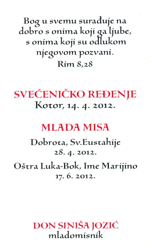 Tu snagu želim don Siniši Joziću." U svom prvom javnom obraćanju, nakon što je primio sakrament svetog reda, don Siniša je istakao kako mu je ovo najveći dan u životu. „Pružam ruku svima dobre volje, koji žele čuti Božji glas, a da ga ja mogu prenijeti", naglasio je naš novi svećenik.