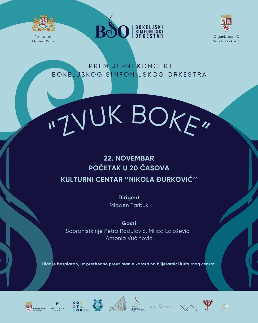 Premijerni koncert Bokeljskog simfonijskog orkestra održat će se 22. 11., u Kulturnom centru „Nikola Đurković“ u Kotoru, s početkom u 20 h. Ulaz je slobodan, uz obvezno preuzimanje karte na biljetarnici Kulturnog centra sat vremena prije početka koncerta.