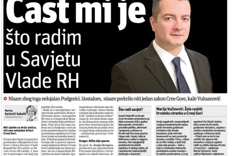 Časno obavljam svoj posao i poslanika u Skupštini Crne Gore i člana Savjeta Vlade Republike Hrvatske za Hrvate izvan Hrvatske. I, kao što to priznaju i oni koji me napadaju, nisam prekršio nijedan zakon Crne Gore - poručuje zastupnik Hrvatske građanske inicijative u crnogorskoj Skupštini, Adrijan Vuksanović, nakon što ga je oporbeno orijentirani list „Vijesti“ u tekstu novinara Siniše Lukovića, napao da kao član Parlamenta jedne države „kreira“ politiku druge. Vuksanović je, naime, u isto vrijeme i parlamentarac Crne Gore i član savjeta Republike Hrvatske.