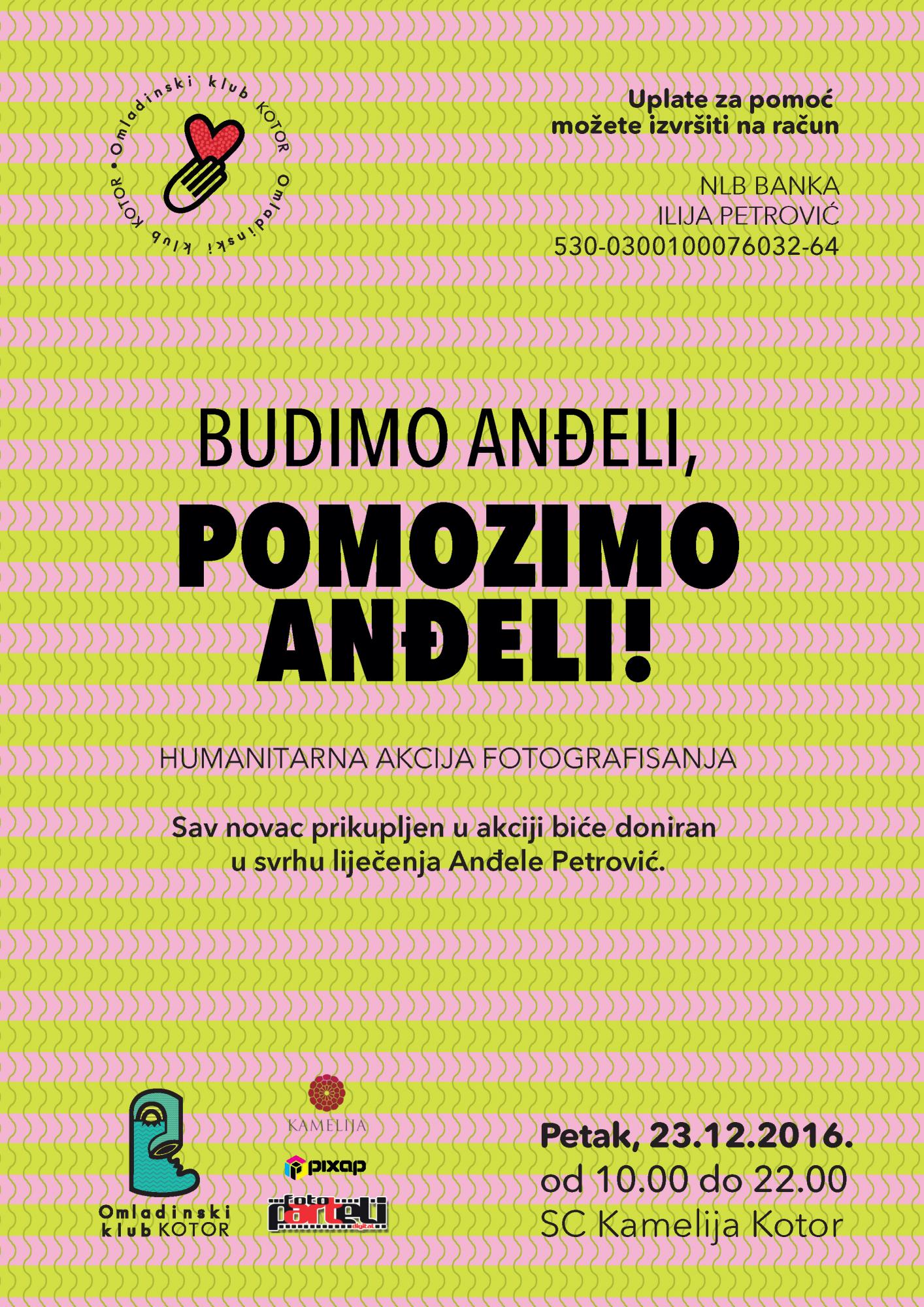 Omladinski klub Kotor postoji da bi promovirao aktivnosti u lokalnoj zajednici s posebnim akcentom na humanitarne akcije i volonterizam. Obavještavamo vas da će biti organizirana humanitarna akcija fotografiranja pod sloganom „Budimo anđeli, pomozimo Anđeli“ i da će sav novac prikupljen u akciji biti doniran u svrhu liječenja mlade Anđele Petrović, kojoj je dijagnosticiran agresivni tumor kostiju.