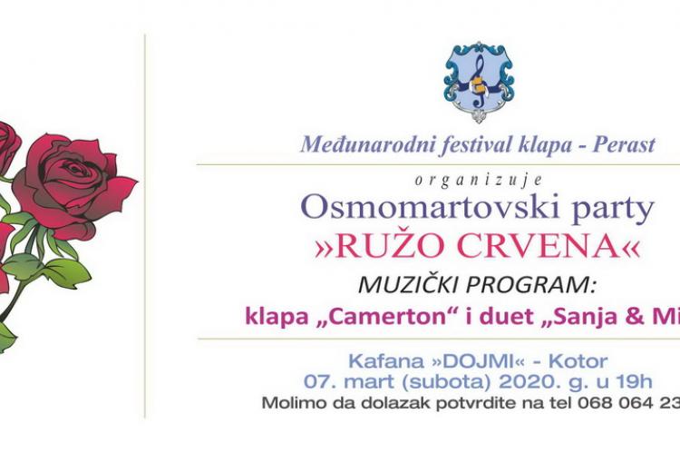 Time to read less than 1 minute Share Print a- a+ Read so far Subota, 07. ožujka 2020. - 9:00Autor: Radio DUX Međunarodni festival klapa Perast organizira Osmomartovski party “Ružo crvena” večeras, 7.3., u kavani “Dojmi” u Kotoru, s početkom u 19 sati. U glazbenom programu nastupit će klapa “Camerton” i duet “Sanja i Mia”. Ulaz je slobodan.