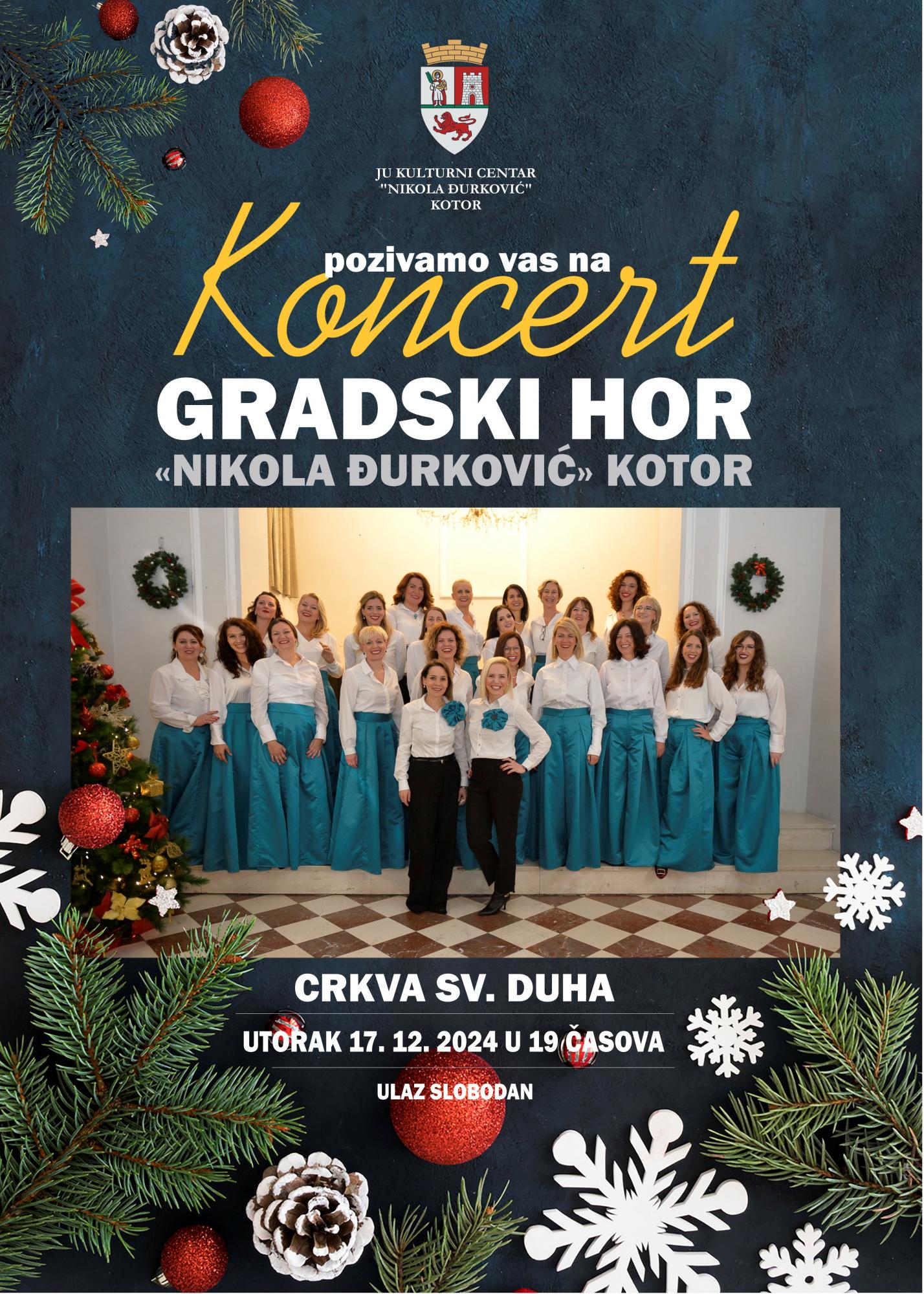 Novogodišnji koncert "Gradskog hora" bit će održan u utorak, 17. 12., u crkvi Svetog Duha, Koncertnoj dvorani kotorske Muzičke škole “Vida Matjan.” Početak je u 19 sati, a ulaz je slobodan. Na programu su djela popularne glazbe inozemnih i domaćih autora. Zbor vode profesorice Dušica Ćetković i Ljiljana Dončić.
