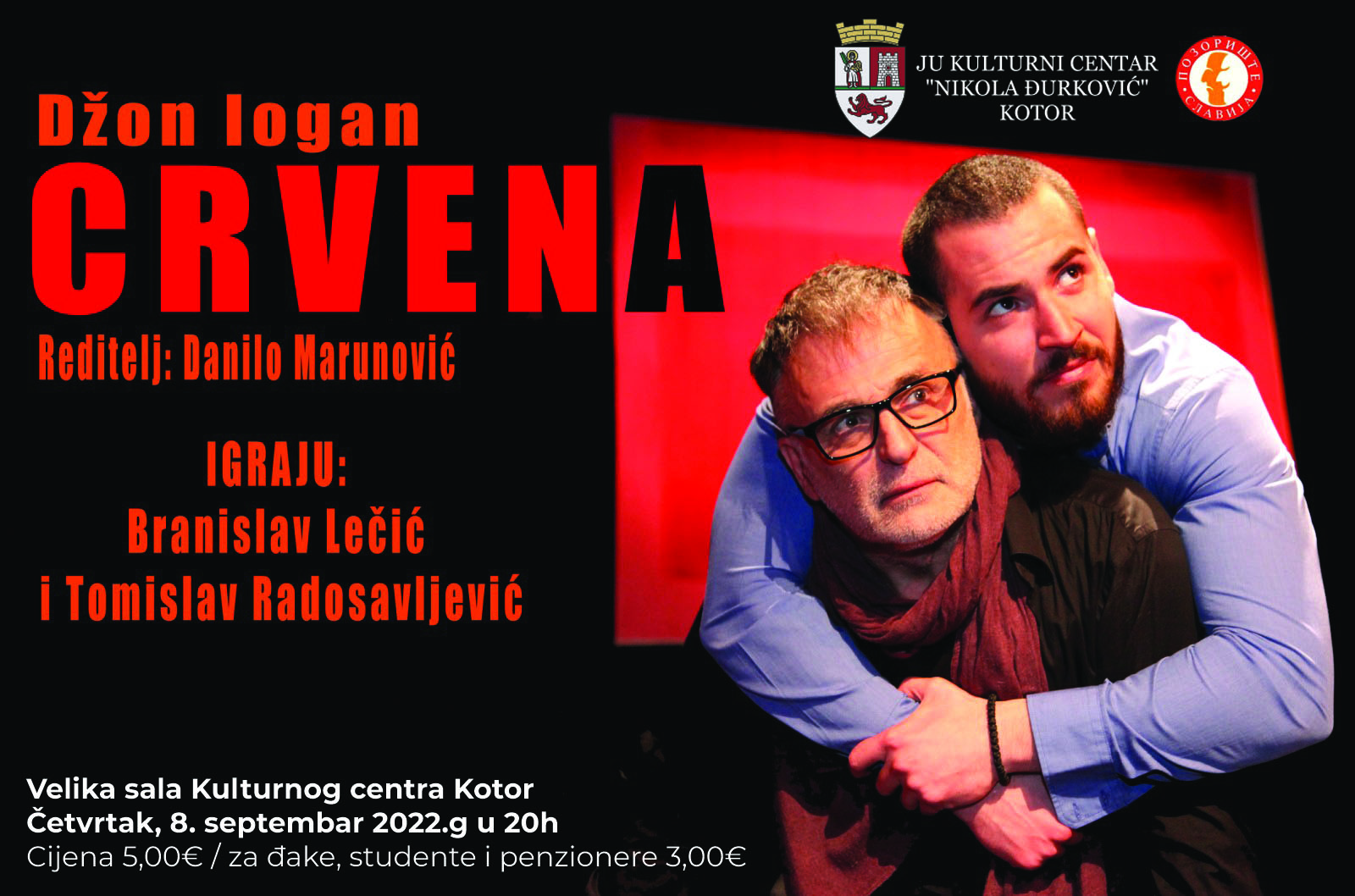 Kazališna sezona u JU Kulturni centar „Nikola Đurković“ Kotor počinje u četvrtak 8. 9.,. predstavom „Crvena“, u režiji Danila Marunovića.