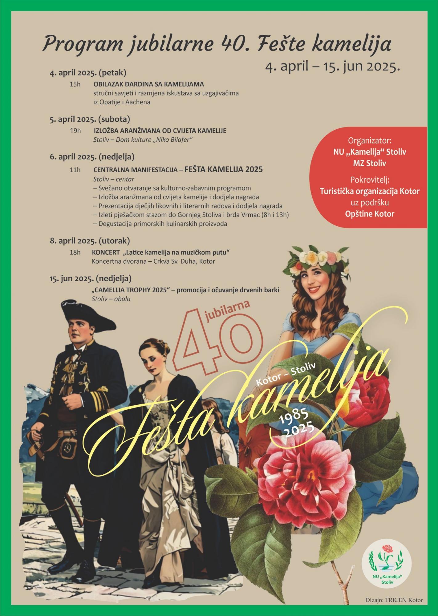 Više o programu jubilarne 40. Fešte kamelija, u organizaciji NU Kamelija Stoliv i Mjesne zajednice Stoliv možete pročitati na priloženom plakatu.