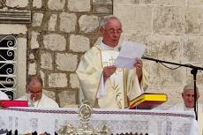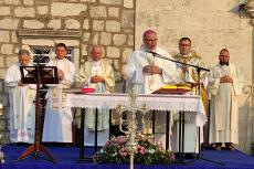 Dakle, i moj i tvoj život, brate i sestro, ogrnut je plaštem Božjega blagoslova i milosti, ogrnuti smo zaštitom i zagovorom svoje nebeske Majke Velike Gospe. To je ujedno i razlog našega hodočašća ovdje u ovo svetište. Kao što se u Gospinu životu ništa nije događalo bez Božjega znanja, ništa se bez Božjega promisla i znanja ne događa ni u našem životu. Zato nam valja biti u blizini Božjoj.“ Božje izabranje, poručio je biskup Ivan, ima dvostruki učinak, s jedne strane je to kruna radosti, a s druge križ žalosti, koji se mogu prepoznati u životu svakog vjernika, a posebno svećenika što je mogao iskusiti i sam slavljenik: „Neka ta radost i nas ovdje prisutne osposobi za služenje Isusu u braći ljudima, onako kako su to činili sv. Leopold Bogdan, bl. Gracije i bl. Ozana i ostali Božji ugodnici Boke. No, budimo svjesni, kao što je to Mariji bilo naviješteno u hramu, da će joj mač boli probosti srce, tako radost koju Gospodin pripušta može i nama donijeti žalost.