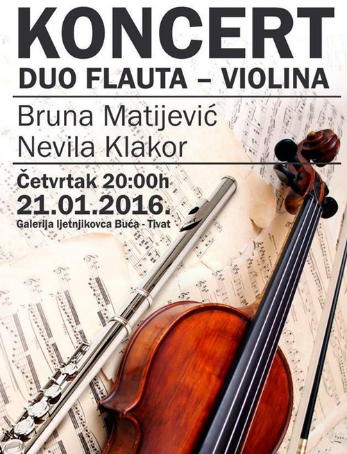 Time to read less than 1 minute Share Print a- a+ Read so far Srijeda, 20. siječnja 2016. - 8:50Autor: Radio DUX U Galeriji ljetnikovca Buća u Tivtu , 21. siječnja ( četvrtak), s početkom u 20 sati očekuje vas koncert klasične glazbe. Nastupit će Bruna Matijević na flauti i Nevila Klakor na violini.