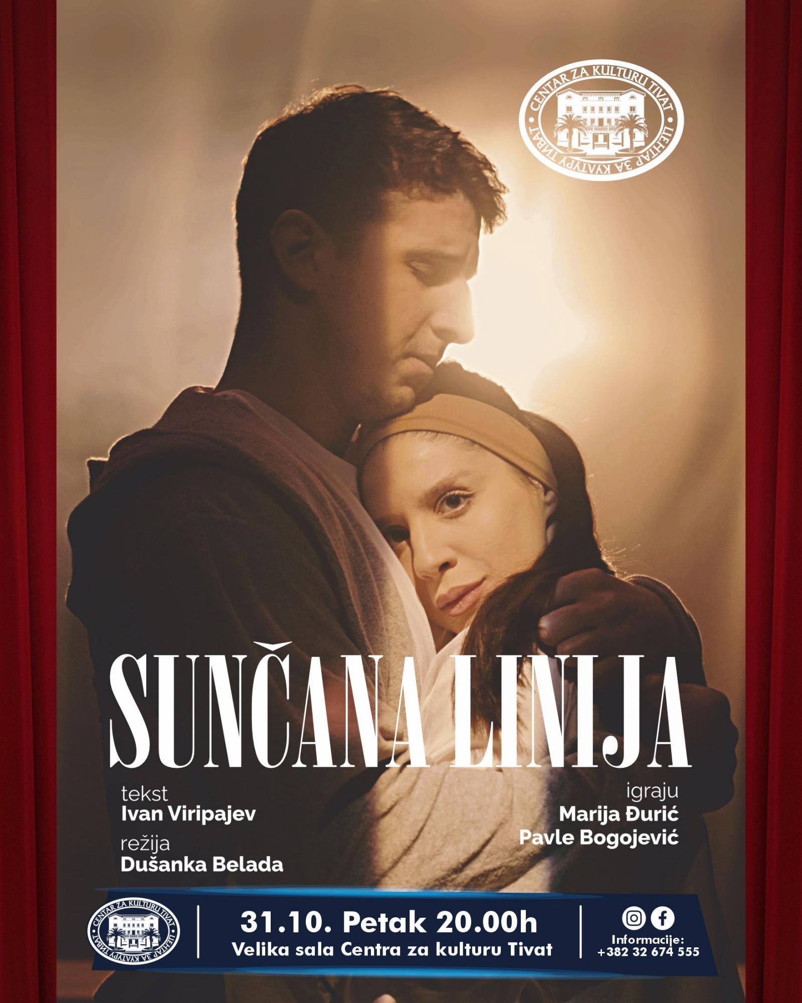 Kazališna predstava „Sunčana linija”, rađena u produkciji Centra za kulturu Tivat, a koju je po tekstu Ivana Viripajeva režirala Dušanka Belada, bit će izvedena večeras u 20 h, u Velikoj dvorani Centra za kulturu Tivat.