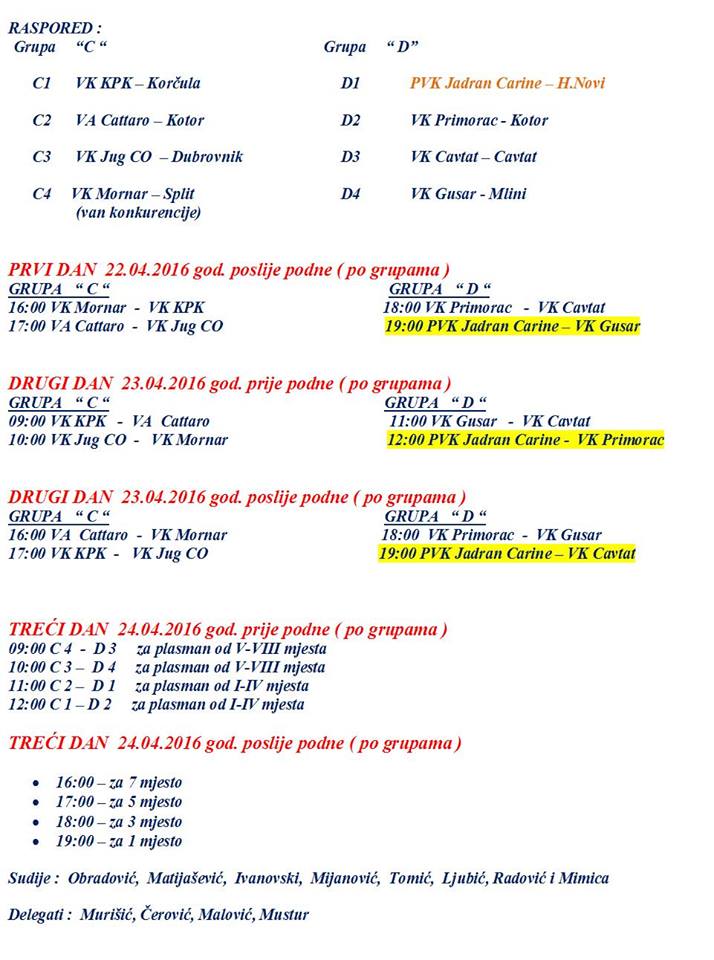 U grupi D danas od 18 sati igraju VK Primorac i VK Cavtat, a u 19 sati susreću se PVK Jadran Carine i VK Gusar.