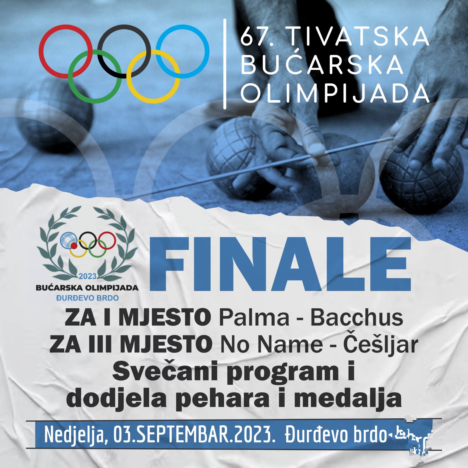 Time to read less than 1 minute Share Print a- a+ Read so far Nedjelja, 03. rujna 2023. - 12:09Autor: Radio DUX Finale Bućarske olimpijade, kao i susret za treće mjesto, održat će se danas, s početkom u 17 h, nakon čega slijedi dodjela pehara i medalja. U finalu Olimpijade igraju: Bacchus - Palma. U susretu za treće mjesto: Česljar - No name.